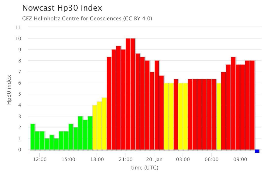 Os números registrados pelo astrônomos venha confirmar. Ontem à noite, o índice Hp30 ultrapassou a marca simbólica de 9. Mesmo fixando-se em 10 entre 22h e 3h. e 23h, horário de Paris, segundo o Centro Helmholtz de Geociências (Alemanha). Nunca experimentei antes!