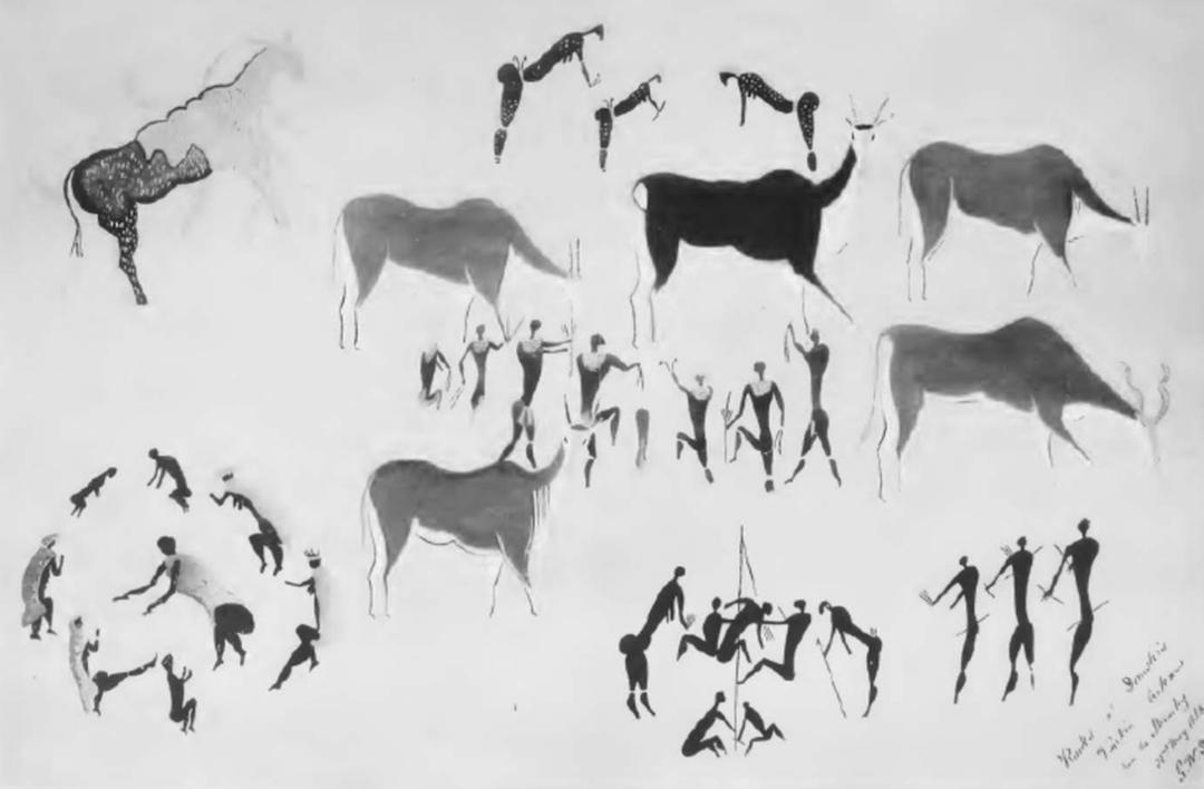 Esta reprodução de pinturas rupestres de San ilustra danças de alces, ligadas a ritos de iniciação feminina, acompanhadas por instrumentos. © Adaptado de Stow and Bleek, 1930 – Margarita Díaz-Andreu