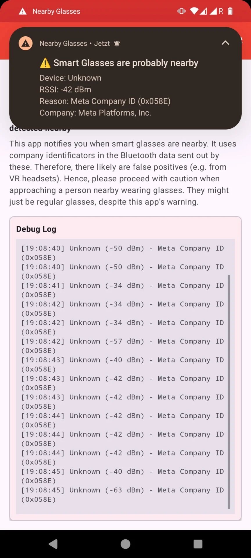 Concretamente, o aplicativo é capaz de exibir automaticamente uma notificação em seu smartphone assim que um par de Ray Ban Meta ou qualquer outro smartglass for detectado. Para isso, a aplicação conta com dados de identificação das empresas (fabricantes dos óculos) presentes nos dados Bluetooth devolvidos pelos óculos.