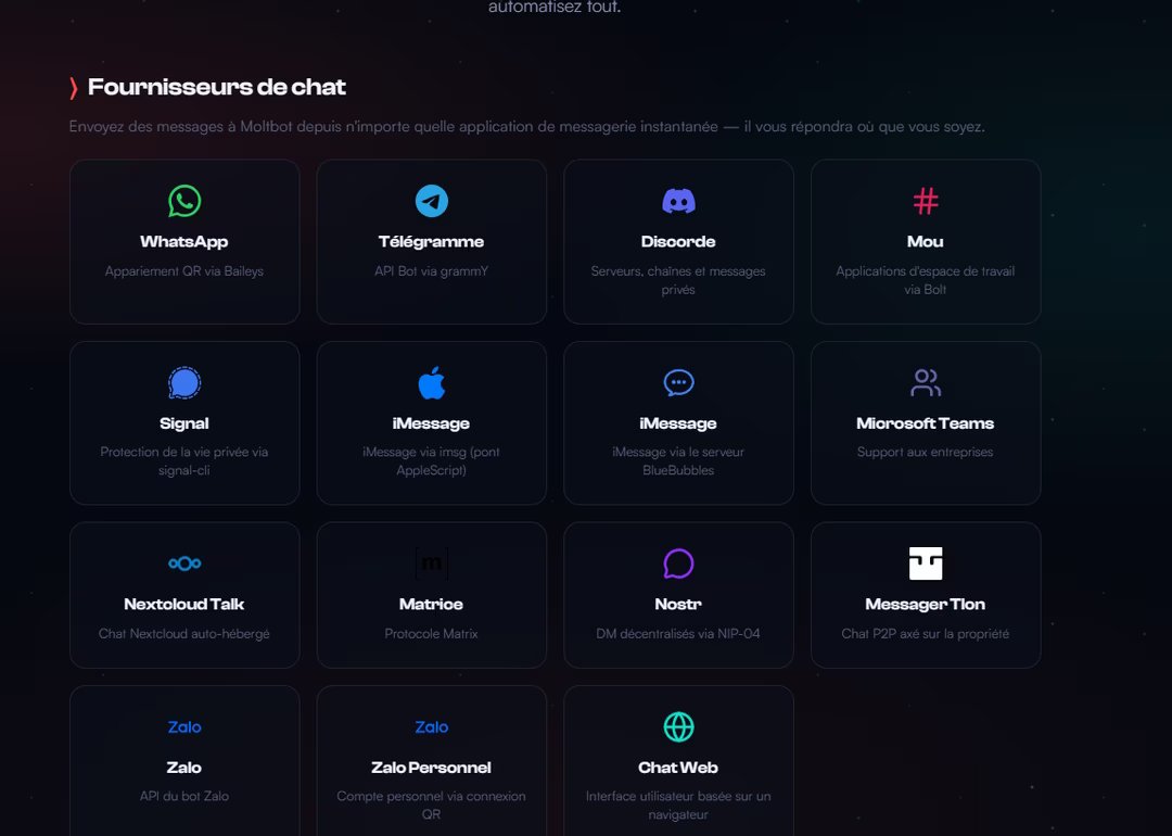 A outra particularidade do Moltbot é que ele não é um aplicativo de chatbot independente, mas sim uma extensão que será anexada a outro aplicativo. Assim, ele pode ser adicionado a um aplicativo como WhatsApp Ou TelegramaiMessage, Folga, Equipes Microsoft…
