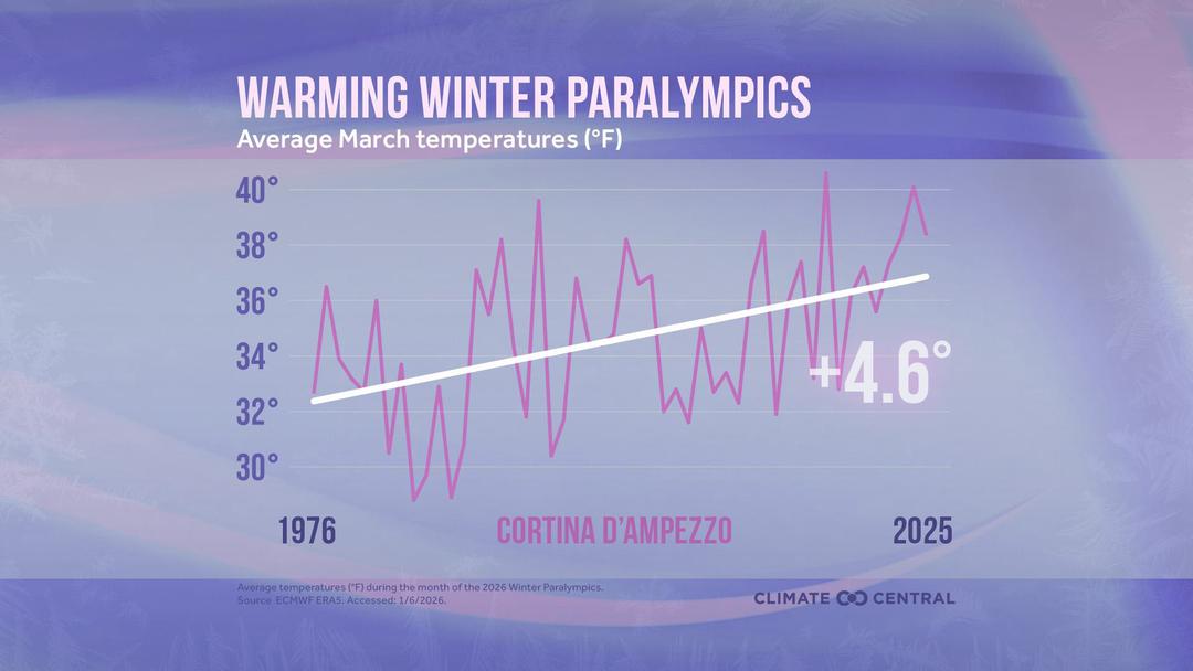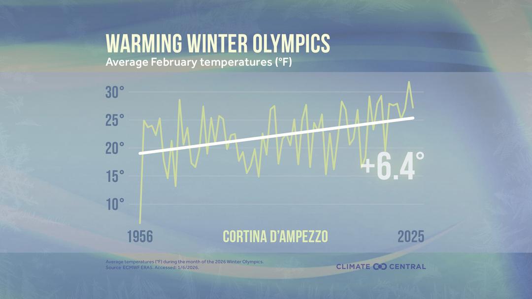 De 1956 a 2026, o clima de Cortina ganhou 6,4°C, em comparação com um aquecimento global médio de 1,3 a 1,5°C (de acordo com diferentes organizações científicas). Hoje em dia, neva em média 41 dias a menos por ano do que em 1956. O resort também perdeu em média 15 centímetros de neve durante o mês de fevereiro desde 1956. Em Milão, que acolhe eventos indoor (hóquei no gelo e patinação artística), o clima aqueceu 3,2°C em 70 anos.
