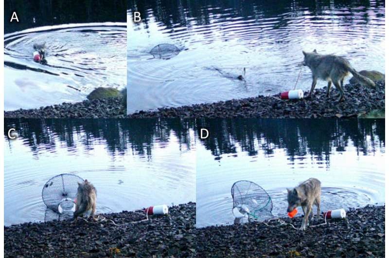 (A – D) Imagens retiradas de um vídeo obtido por uma câmera remota mostrando um lobo, no território de Haíɫzaqv, puxando uma armadilha de caranguejo verde inicialmente submersa em direção à costa para acessar a isca contida em seu interior. Crédito: © Ecologia e Evolução (2025).
