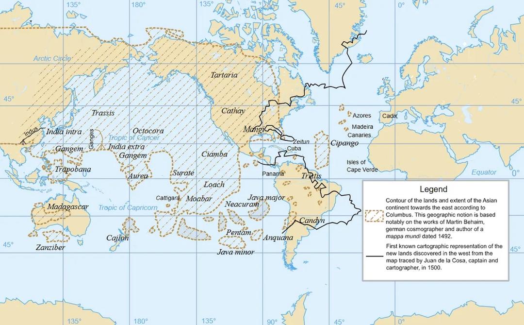 Comparação das parcelas costeiras de Juan de la Cosa (linha preta) e Martin Behaim (linha pontilhada clara) com o litoral real. © Mindriot, Wikimedia Commons