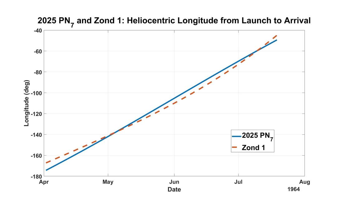 Com a ajuda de Adam Hibberd, engenheiro membro da ONG Iniciativa para Estudos Interestelareso astrônomo procurou refazer a trajetória do longitudes heliocêntrico seguido pela missão Zond 1 para compará-los com os de 2025 PN7. No papel, as semelhanças são realmente impressionantes.