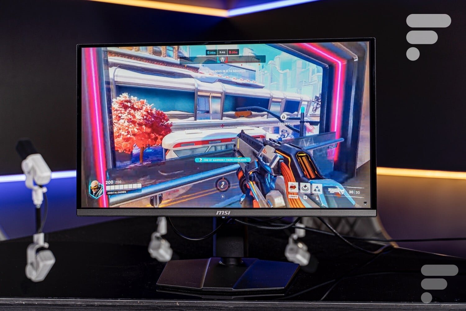 Os acabamentos também são de boa qualidade para a tela deste PC. Apesar do visual minimalista, encontramos na parte traseira do monitor uma faixa de luz MSI na parte central onde está o logotipo “ forte » no revestimento. Uma vez colocado na sua mesa, ele ocupa pouco espaço com sua diagonal de 27 polegadas e pode ser totalmente girado para uso vertical ou inclinado em um ângulo de 30 graus para frente e para trás, com ajuste de altura confortável.