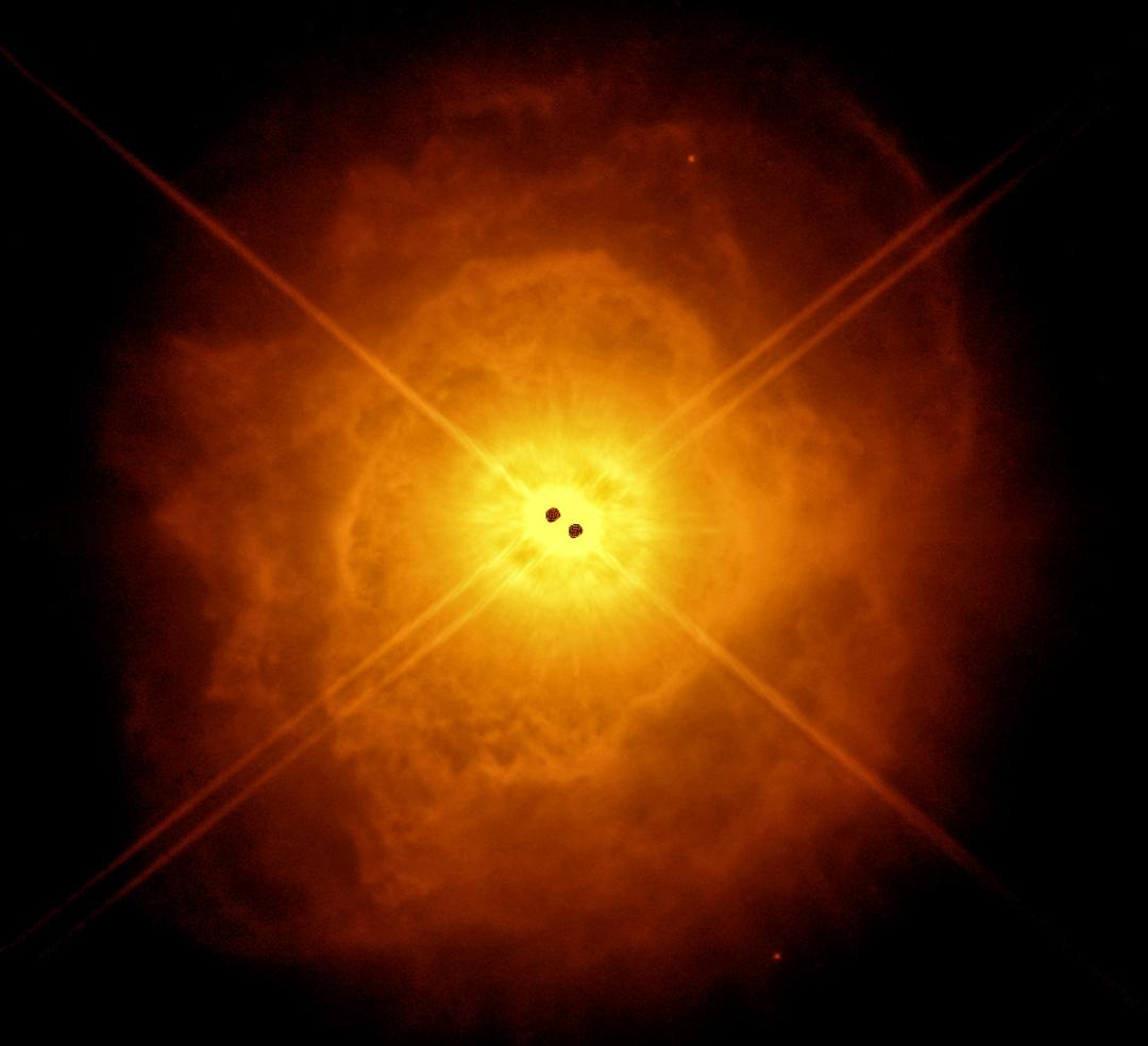 O sistema binário AFGL 4106 — os dois pontos pretos no centro da imagem — e a nebulosa que o rodeia — em laranja. A imagem foi obtida com o instrumento SPHERE do Very Large Telescope (VLT, Chile). © G. Tomassini et al., ESO