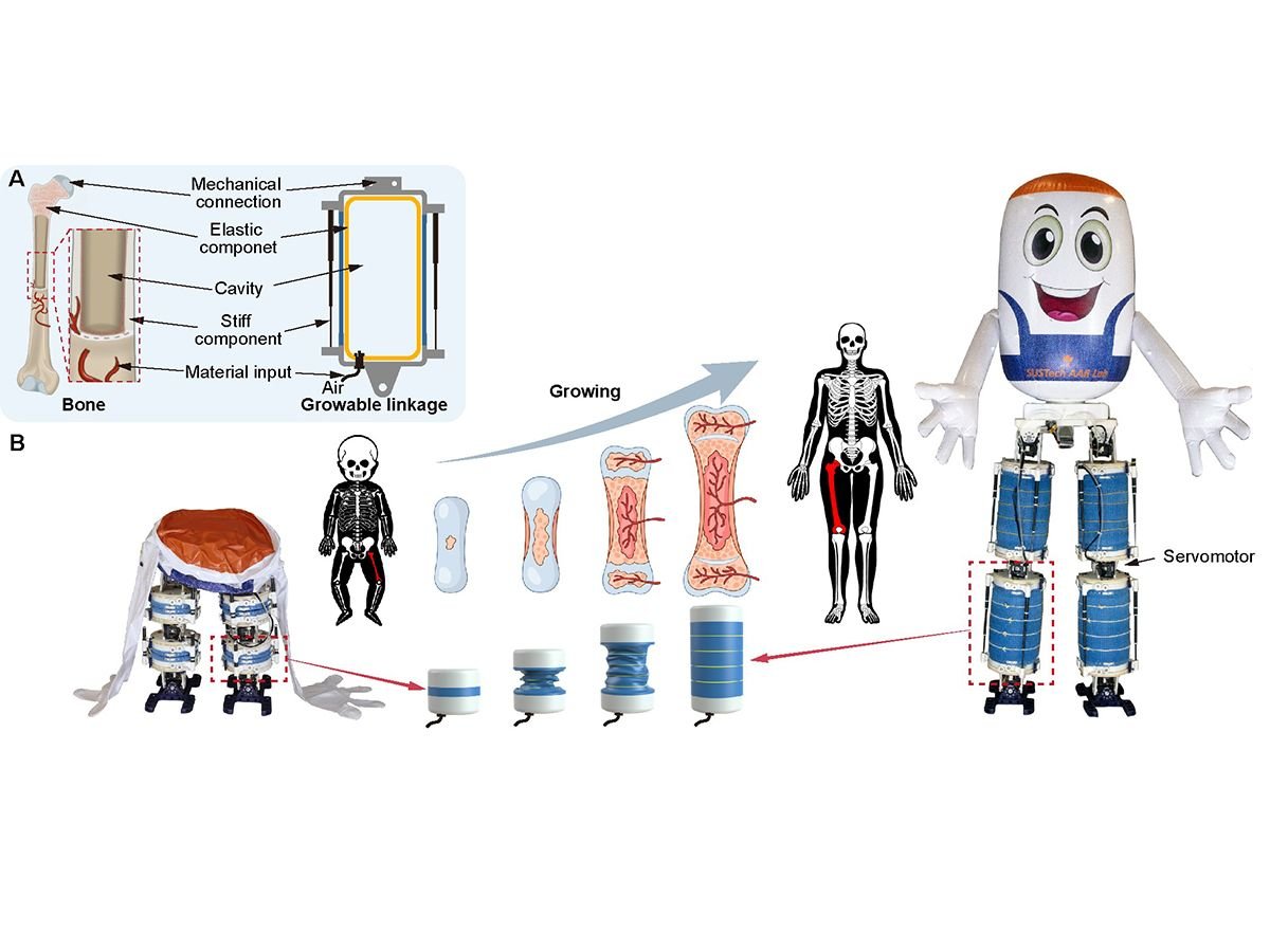 Adicione a isso a possibilidade de deitar. Mas se um osso humano em crescimento cresce pouco a pouco e não pode voltar atrás, o deste robô chamado GrowHR pode crescer e contrair-se indefinidamente. Assim, o tamanho desse bípede artificial pode passar de 49cm de altura para 1,36m – um ganho de tamanho de 278%. Por trás dessa façanha, um dispositivo expansível composto por câmaras infláveis, que dá ao conjunto… um ar de acordeão!