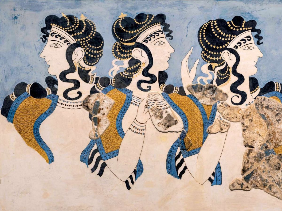 “Toda a iconografia, dos selos aos afrescos, confirma a primazia das mulheres.” Uma característica marcante principalmente nas representações sagradas. “Originalmente, os minóicos praticavam uma religião da natureza, deixando oferendas em promontórios ou em cavernas. Mas, a partir de 1650 a.C., surgiram uma ou mais divindades femininas, as topless, brandindo cobras.” Por volta de 1450 AC. AC, esta figura será suplantada por Zeus – sinal do apagamento, em benefício dos micênicos, de uma cultura abalada pela erupção vulcânica de Santorini, em 1530 AC. AD, e que se encontra minado pelo crescente elitismo.
