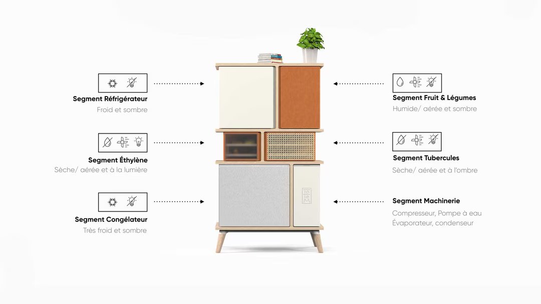 Batizado Totemcombina, portanto, princípios ancestrais com tecnologias modernas para substituir os frigoríficos tradicionais e, assim, reduzir o consumo de energia.energia e desperdício de alimentos. Utiliza resfriamento evaporativo em determinadas áreas, permitindo a conservação dos alimentos sem eletricidade graças às paredes duplas em argila. Os compartimentos frigorífico e congelador são isolados por vácuo entre duas paredes, o que reduz a perda de calor e melhora a eficiência energética. Cada compartimento é adaptado às necessidades específicas dos alimentos em matéria temperatura, umidade e luz.