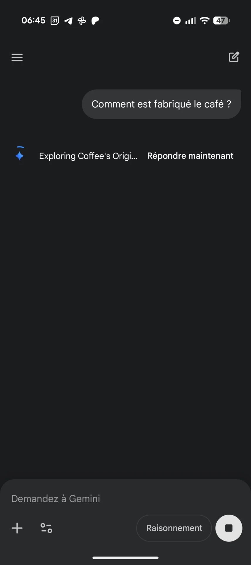 Ao pressionar o botão “Responder Agora”, aparecerá uma confirmação indicando “Omissão de Raciocínio Adicional”. Mas isso não significa que a ferramenta mude de modelo instantaneamente. Com efeito, Gêmeos continua a utilizar o modelo selecionado inicialmente (Pro ou Raciocínio), mas simplesmente força a resposta sem finalizar o ciclo completo de raciocínio. É bastante prático para pedidos simples onde você percebe, depois do ocorrido, que uma longa reflexão não é essencial.