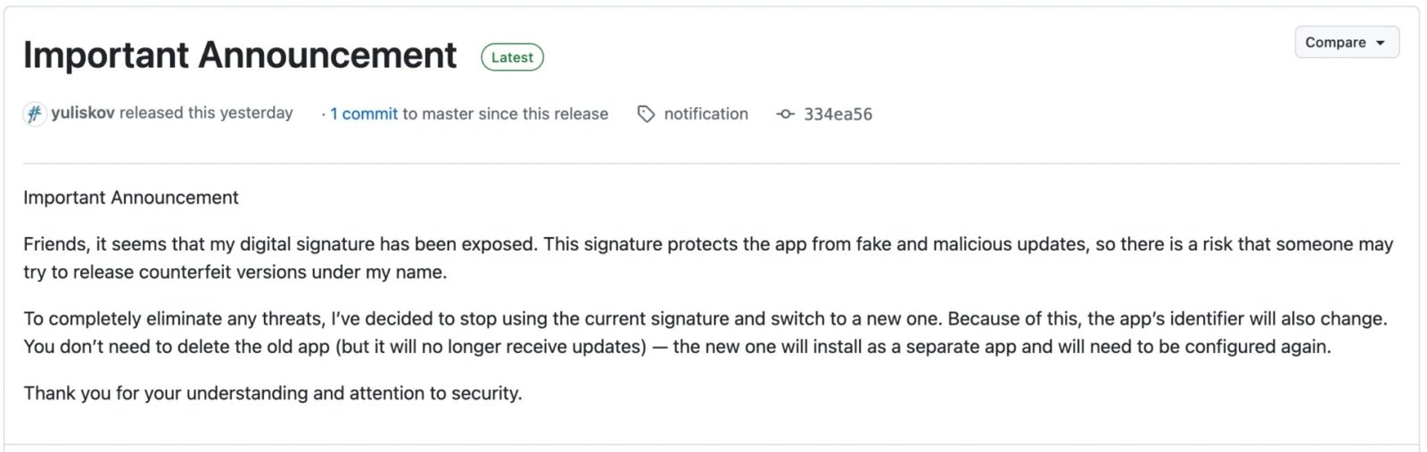 O desenvolvedor, conhecido como yuliskov, falou rapidamente no GitHub e no Patreon. Ele explica que a assinatura digital do aplicativo foi comprometida. Esta assinatura é usada para garantir que as atualizações realmente vêm dele. Sem isso, uma pessoa mal-intencionada poderia distribuir uma versão modificada e, portanto, potencialmente perigosa. Para evitar isso, o Google Play Protect agiu de forma preventiva, o que explica o bloqueio em dispositivos Android TV.