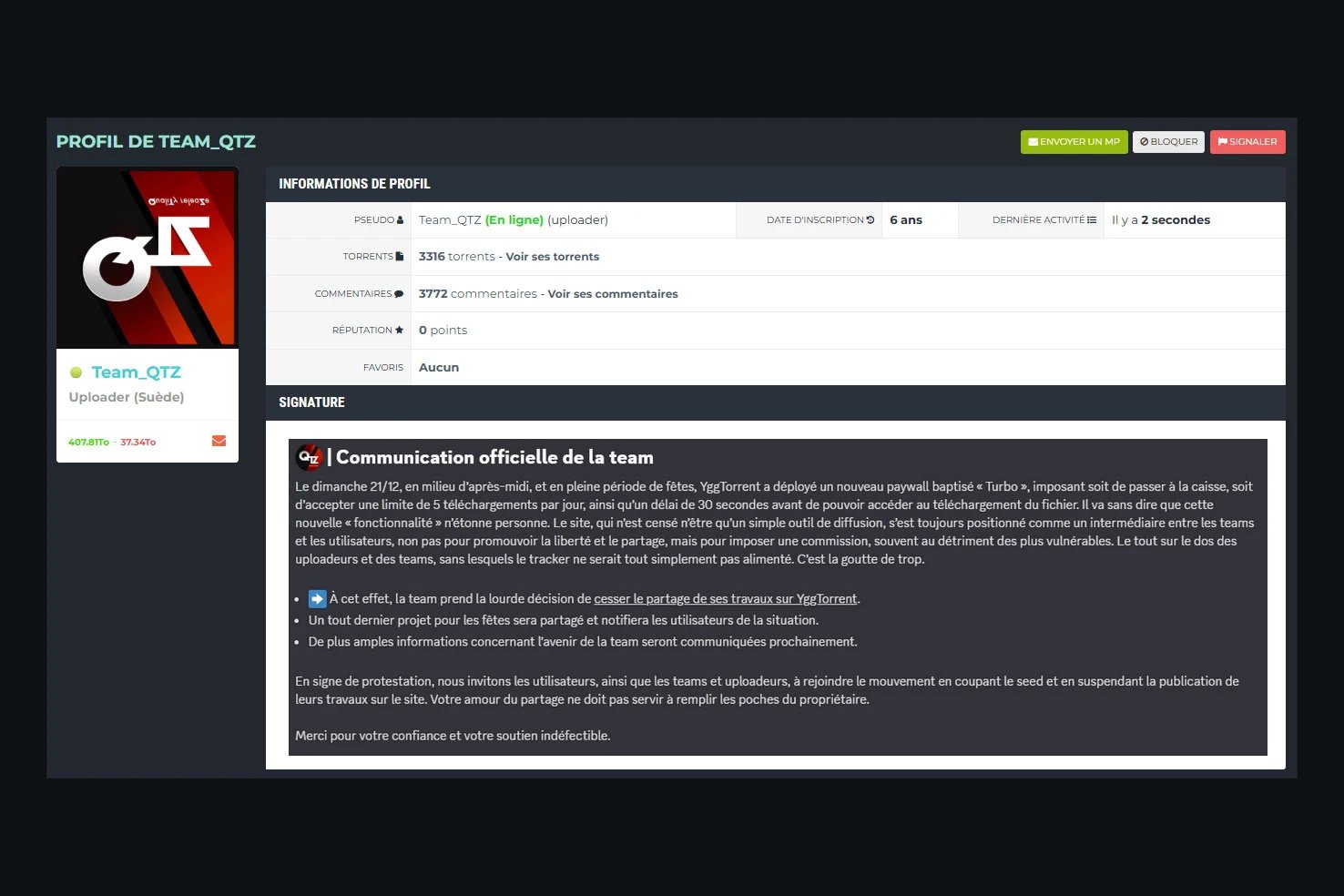 A equipe QTZ, famosa por suas codificações de filmes de alta qualidade (“4K Light”) e pilar do catálogo do site, publicou um comunicado de imprensa incendiário para denunciar essa mudança mercantil. Nesta mensagem, a equipe castiga uma plataforma que “sempre se posicionou como intermediária […] não para promover a liberdade e a partilha, mas para impor uma comissão”.