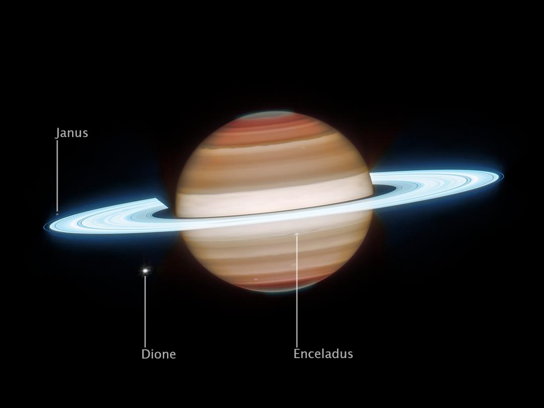 Na imagem infravermelha do telescópio Webb, os anéis parecem extremamente brilhantes porque são compostos de água gelada altamente reflexiva. Também podemos ver detalhes sutis, como os raios e a estrutura do anel B (a espessa região central dos anéis), que diferem entre os dois observatórios. O anel F mais externo parece fino e nítido na imagem do Webb, enquanto brilha ligeiramente na do Hubble. © NASA, ESA, CSA, STScI; Processamento de imagem: Joseph DePasquale (STScI)