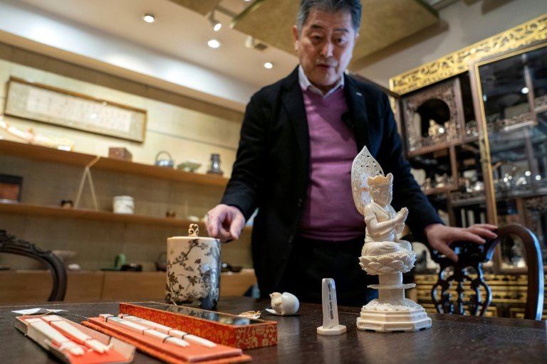 Pauzinhos, estátuas budistas ou bonecos: Hajime Sasaki diz que os objetos de marfim em sua loja de antiguidades em Tóquio atraem um fluxo constante de turistas vindos da China, onde o comércio desse material é proibido.