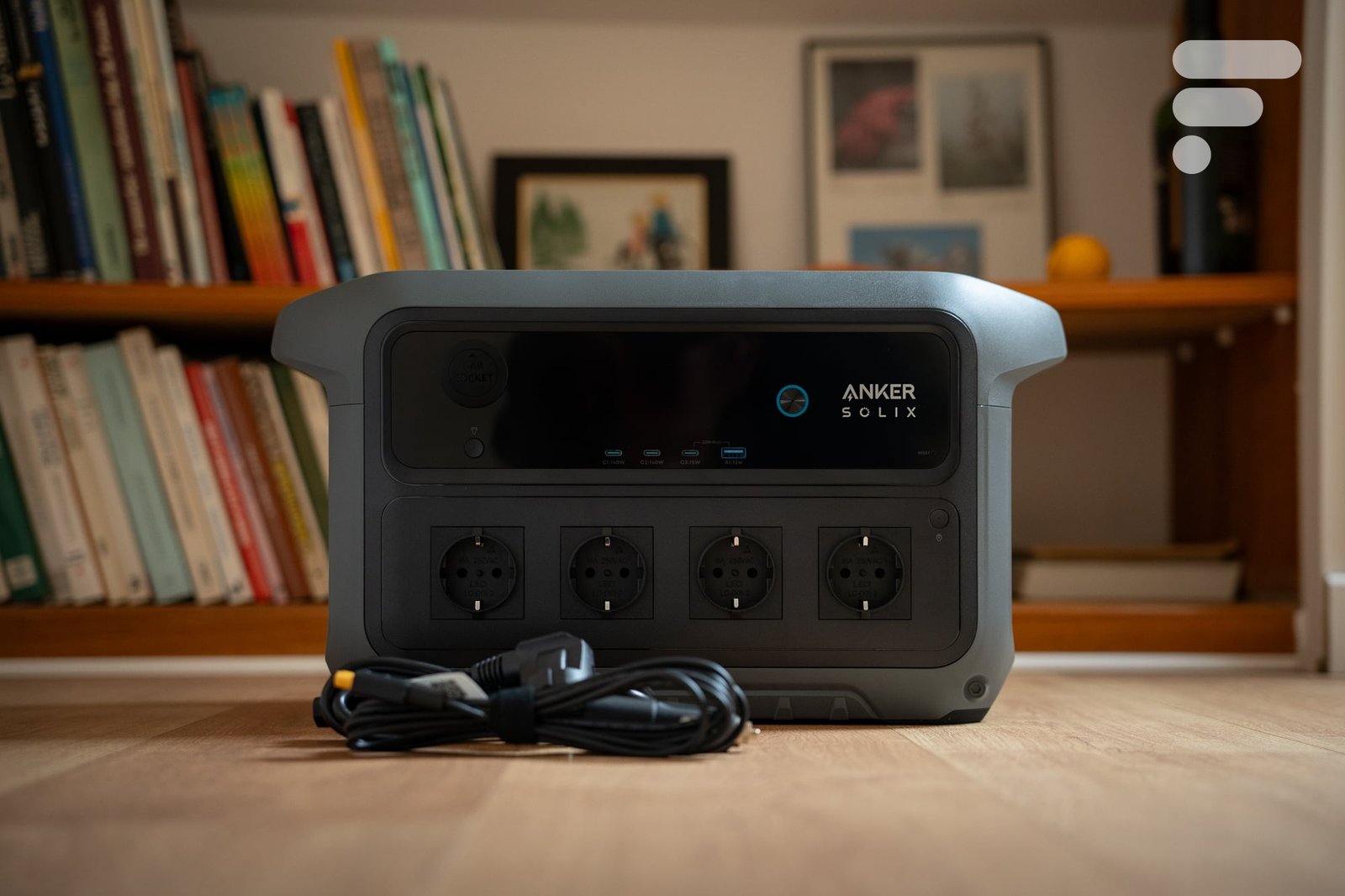 Dès le déballage, la qualité perçue de cette C2000 Gen 2 est excellente. Au-delà de son design, on apprécie l’attention portée aux détails, comme ces scratchs qui permettent de bien ranger les câbles siglés Anker, ou l’ergonomie des poignées de transport. La partie haute de la face avant arbore un aspect piano black, dans lequel se fond l’écran LCD. À l’allumage, ce dernier se distingue de celui de certaines rivales grâce à sa cinématique. Cela ne le rend pas plus lisible, mais participe à l’impression de qualité perçue.