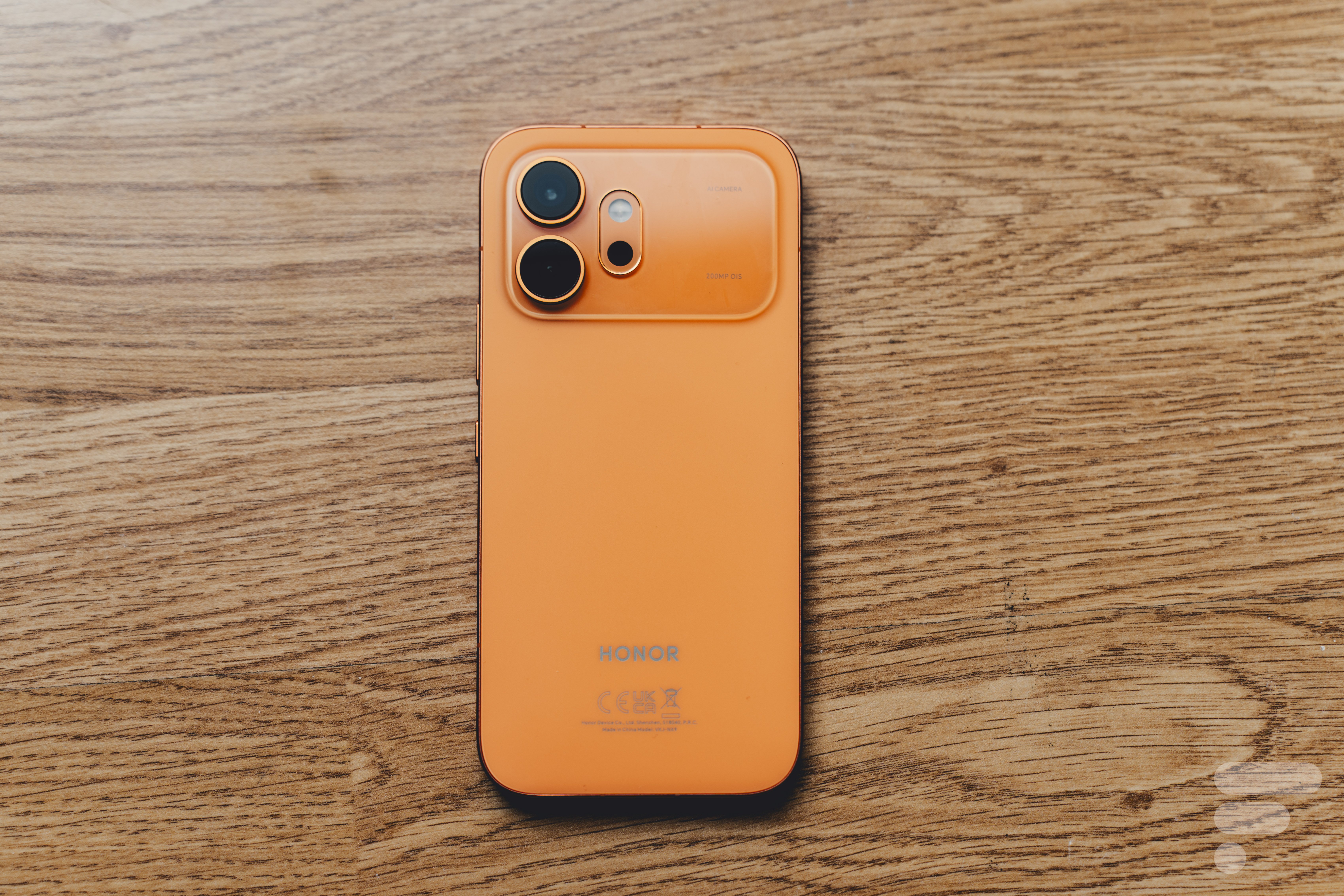 Sur le pourtour, on trouve un bouton similaire à celui de l’appareil photo sur les iPhone. Il est positionné au même endroit. Un appui long déclenche l’IA de Honor, un double clic ouvre l’app Appareil Photo. Ça reste un bouton simple, pas de possibilité de zoomer avec, par exemple. Dernier point, je regrette de voir le marquage légal affiché en gros au dos du téléphone, Honor aurait pu le glisser sur une tranche et dans une couleur moins tranchée.