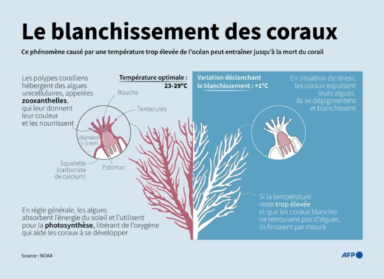 Os corais, barreiras contra a erosão e reservatórios de biodiversidade, que também armazenam carbono, branqueiam sob o efeito do calor, o que os torna particularmente vulneráveis ao aquecimento global. Nos oceanos mais quentes, eles expulsam os microorganismos que lhes conferem cores brilhantes e lhes fornecem alimento, acabando por morrer de fome.