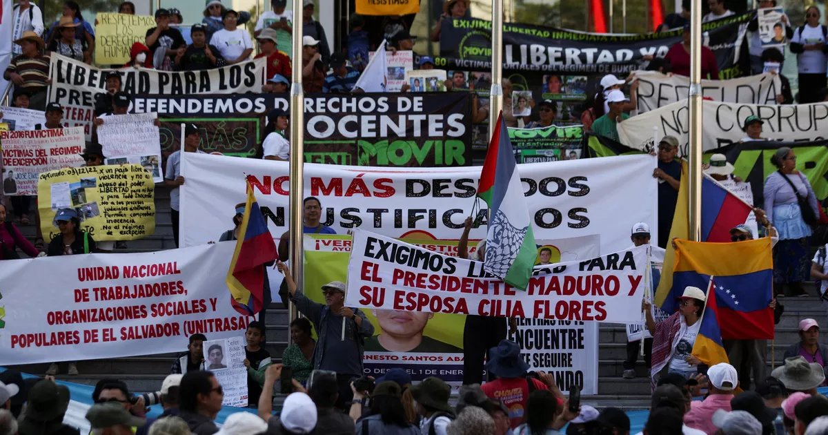 Muitos manifestantes reuniram-se em San Salvador no domingo para protestar contra o estado de exceção estabelecido em 2022 pelo presidente Nayib Bukele, que permite prisões sem mandado como parte da sua cruzada contra gangues. Mais de 90 mil pessoas foram presas e apenas cerca de 8 mil delas foram libertadas após serem consideradas inocentes, segundo fontes oficiais.