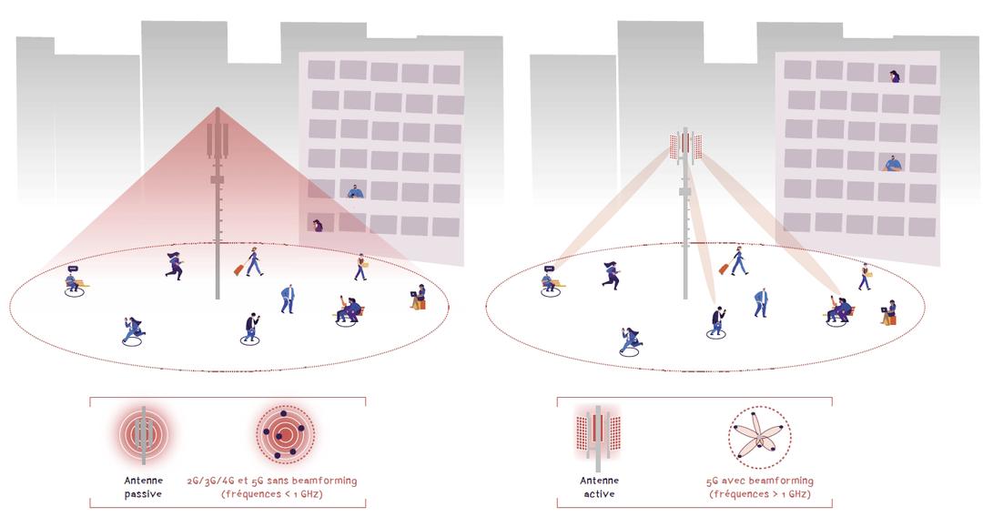 Para todas as gerações de redes cuja frequência seja inferior a 1 GHz, as antenas irradiam para cobrir permanentemente qualquer móvel que possa estar dentro do seu alcance. Nas áreas urbanas, o 5G explora o formação de feixe: a antena só fornece dados direcionalmente se o dispositivo conectado solicitar. O resultado final é menos radiação, menor consumo de energia, maior rendimento e menos latência. © Arcep