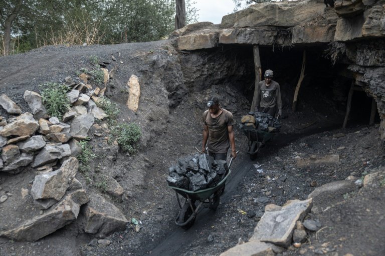 Outros empurram cargas que pesam até 100 quilogramas a toda velocidade através de túneis e depois sobem uma colina íngreme até camiões usados para entregar carvão a vendedores informais na cidade vizinha de Ermelo, na província oriental de Mpumalanga, o coração do carvão do país.