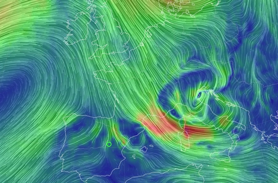 Este mapa de vento mostra o contorno da depressão no sudeste da França e o fluxo noroeste no resto do país. © Nullschool