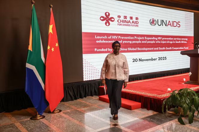 A Diretora Executiva do UNAIDS e Subsecretária Geral da ONU, Winnie Byanyima, durante o lançamento de um projeto para expandir os serviços de prevenção do HIV na África do Sul, na Embaixada da China em Pretória, 20 de novembro de 2025.