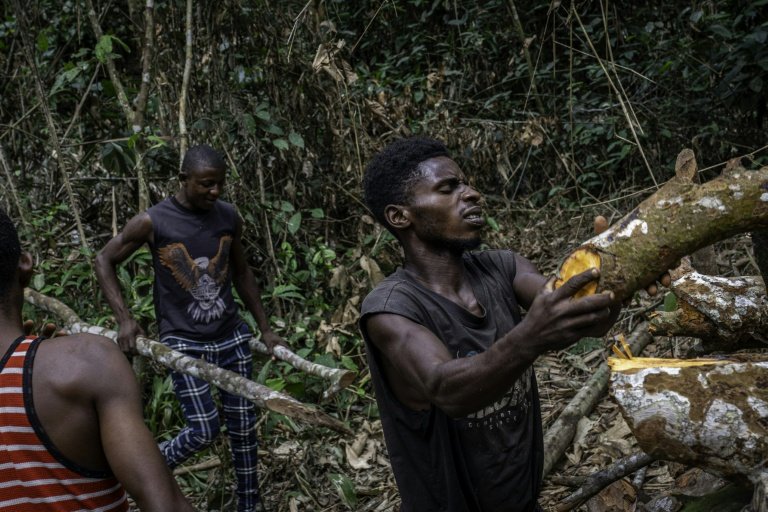 “De agora em diante, administraremos nossa floresta como quisermos”, comemora Jean-Paul Bitiaongi, ao pé de gigantes derrubados por motosserras.