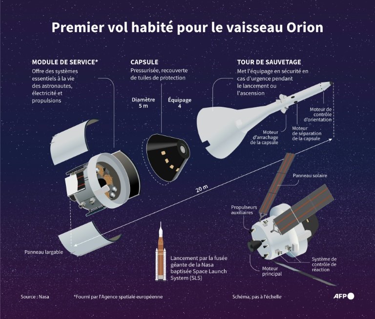 Instalado a algumas centenas de metros da sala de imprensa, o poderoso foguete lunar SLS transportará três americanos (Reid Wiseman, Christina Koch e Victor Glover) e um canadense (Jeremy Hansen) até a Lua, que contornarão sem pousar.