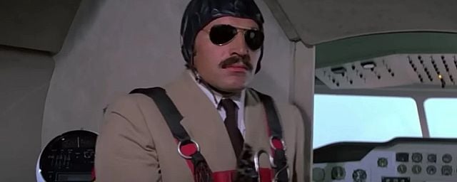 Nesta sequência espetacular, Castaldi, jovem e quase irreconhecível com seus óculos e bigode, não está presente para interpretar os figurantes. Ele interpreta o piloto do avião que briga com James Bond, interpretado por Roger Moore. O duelo começa dentro da aeronave e continua no ar, com um confronto impressionante. Bond consegue capturar o pára-quedas de Castaldi antes que o formidável Tubarão, por sua vez, venha desafiar o agente secreto.
