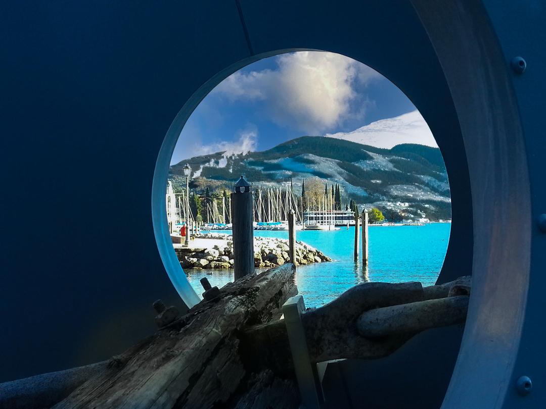 Através desta vigia metalo olhar permanece sobre um fragmento da paisagem, como se fosse através da lente de um instrumento científico. Os estratos montanhosos testemunham milhões de anos de convulsões, esculpidas pela ação das geleiras e dos ventos. Cada nuance de rocha, cada linha de relevo conta a história antiga do Lago de Garda, onde a geologia se torna memória viva. Entre a luz e o silêncio, a natureza oferece aqui um fascinante prelúdio à descoberta deste lugar excepcional.
