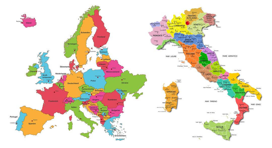 Mapa da Europa © Holly Molly Adobe stock – Mapa da Itália © Antonio Scalinci Adobe stock – Red dot Lago Garda