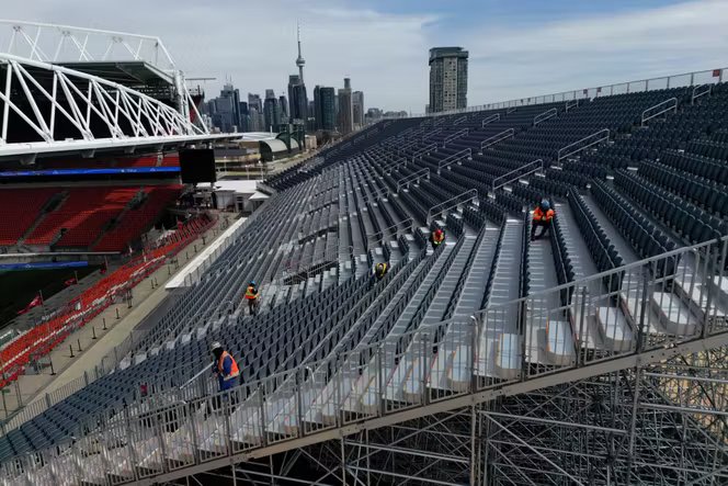 Trabalhadores instalam estandes temporários próximos aos estandes regulares no BMO Field em Toronto, Canadá, em 24 de março de 2026.