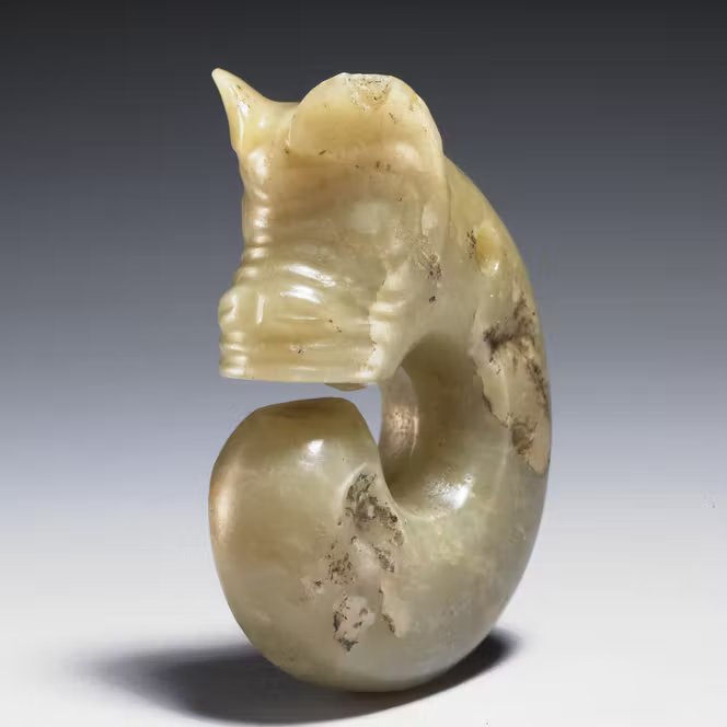 Nós o vemos aqui emergindo do ovo, já no Neolítico, em ornamentos de jade encontrados nos túmulos de falecidos de alto escalão. Ainda não parece tão bom: mais um “porco-dragão”, aparece com focinho e orelhas pequenas num dos primeiros objetos que o representam, datado de cerca de 3000 a.C.