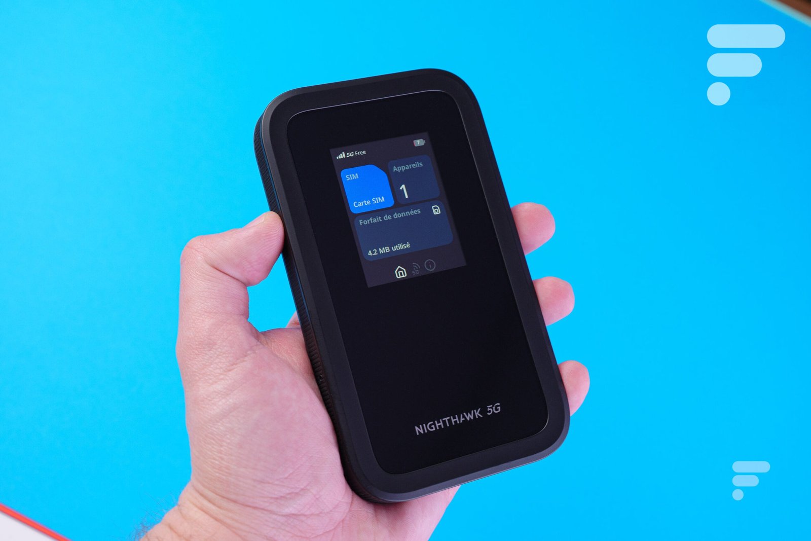 Na verdade, a Netgear equipou o Nighthawk 5G M7 com uma pequena tela LCD, que ocupa apenas metade do painel frontal. Este exibe um resumo das principais informações do dispositivo: status da rede, uso de dados, nível de bateria, etc. É aqui que serão exibidas as informações da rede Wi-Fi para facilitar a conexão de novos dispositivos.