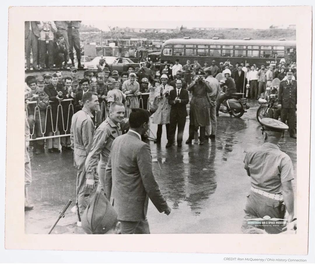 O retorno, ainda que heróico, da missão Gemini 8 ao Japão não foi planejado. Poucos jornalistas estiveram presentes para imortalizar a cena. © Ron McQueeney, Museu Aéreo e Espacial Armstrong