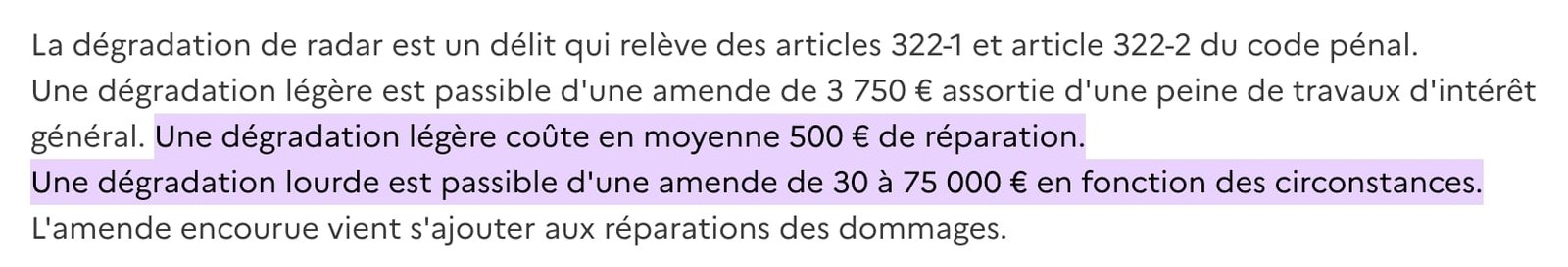 Porém, essas despesas são financiadas com dinheiro das multas… e do contribuinte. A receita também é utilizada para implantar novos sistemas de controle e manter os cerca de 3.400 dispositivos atualmente distribuídos pelo território. Para os responsáveis por estes danos, as penas são pesadas: até 75 mil euros de multa e cinco anos de prisão, ou ainda 100 mil euros e sete anos em caso de ação coletiva ou cometida por pessoas mascaradas.