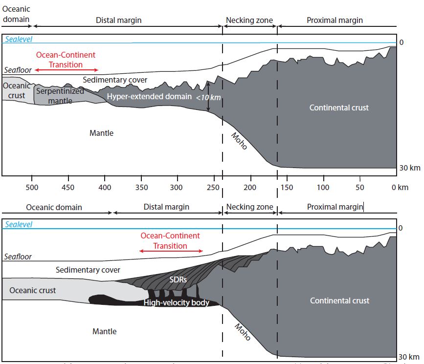 Arquitetura final de dois tipos de margens continentais, no final do séc. romper final e o estabelecimento de uma nova crosta oceânica (margens pobres em magma na parte superior e ricas em magma na parte inferior). A fase de estrangulamento leva à formação do “ zona de carícias » que se caracteriza por um afinamento repentino da crosta continental. ©Morgane Gillard
