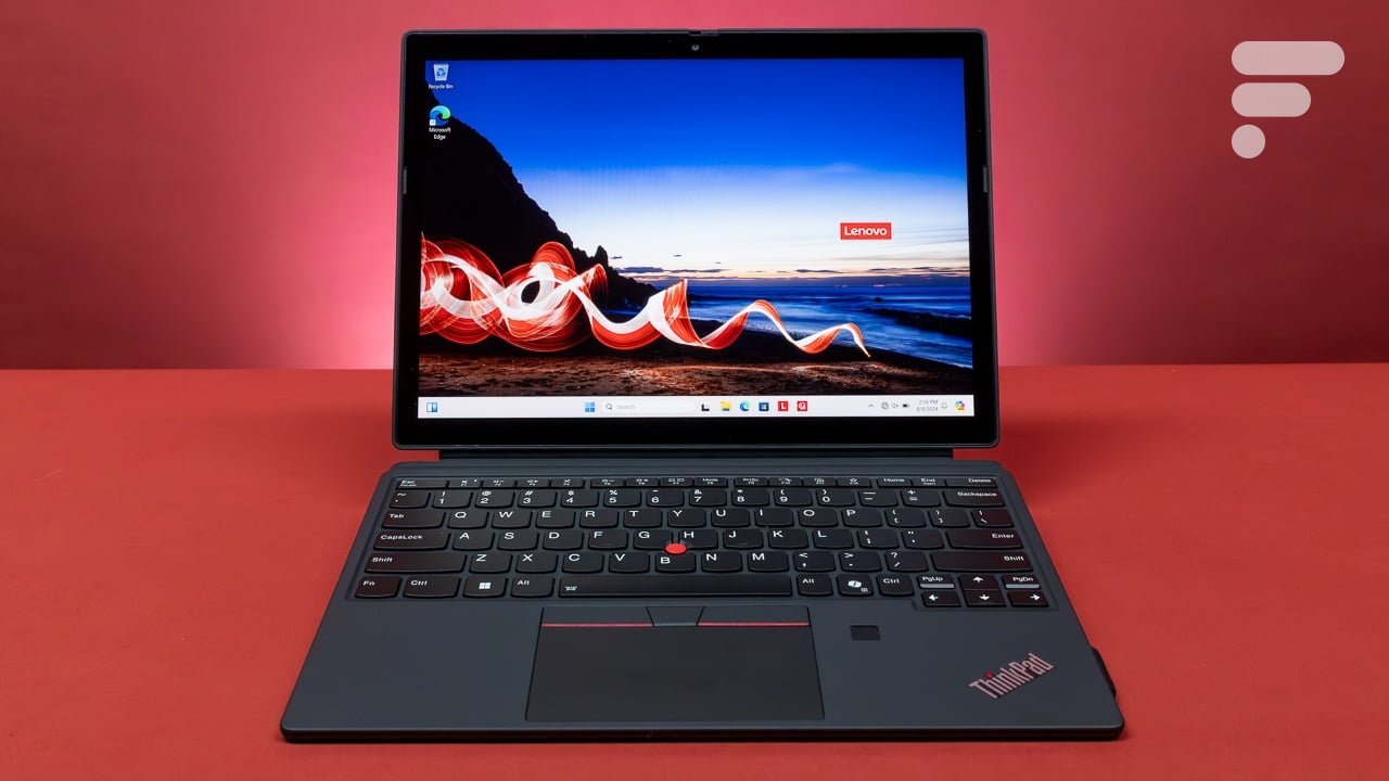 Visualmente, o aparelho ostenta a cor “ Eclipse Preto » emblemático da linha ThinkPad. Se talvez não seja tão fino e refinado ao milímetro como um Surface Pro 13, é para manter a robustez da linha ThinkPad.