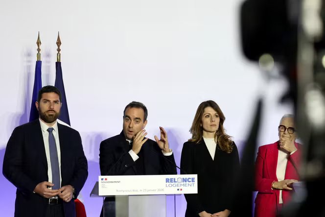 O Primeiro-Ministro, Sébastien Lecornu, com o Ministro da Habitação, Vincent Jeanbrun, a porta-voz do governo, Maud Bregeon e a Ministra da Descentralização, Françoise Gatel, em Rosny-sous-Bois (Seine-Saint-Denis), 23 de janeiro de 2026.