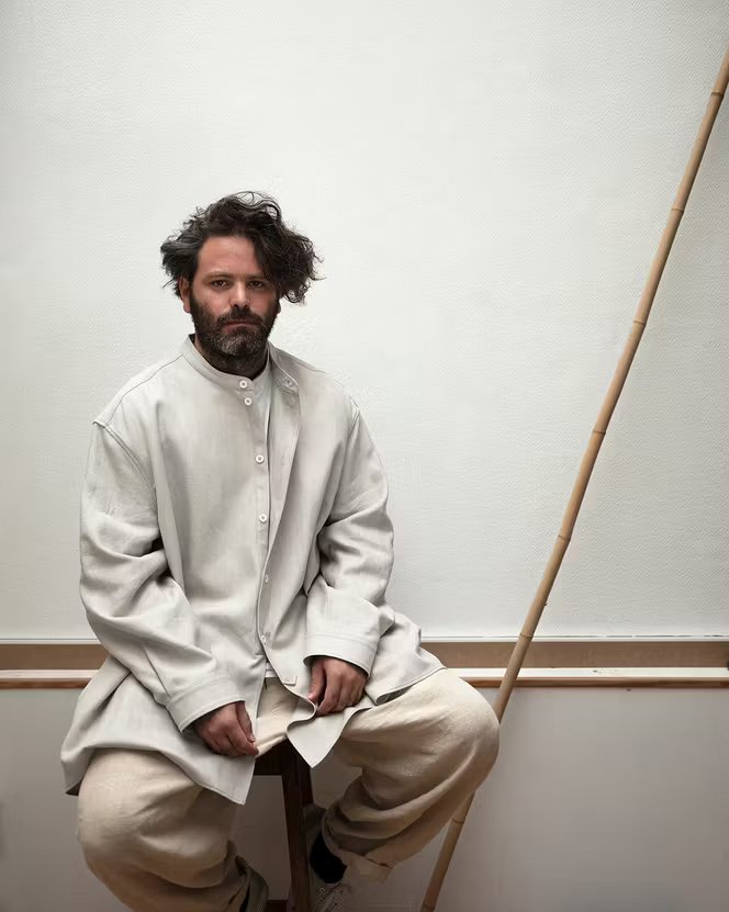 A imagem fica borrada e a tela treme. Hed Mayner vira a câmera do computador para mostrar a vista das montanhas e do verde outonal da paisagem circundante. O estilista está, de facto, radicado em Bérgamo, Itália, há várias semanas, para estar o mais próximo possível das fábricas têxteis que trabalham na sua próxima coleção. Ele apresentará este último, o outono-inverno 2025-2026, no Pitti Immagine Uomo, o grande desfile de moda masculina que acontece duas vezes por ano em Florença.