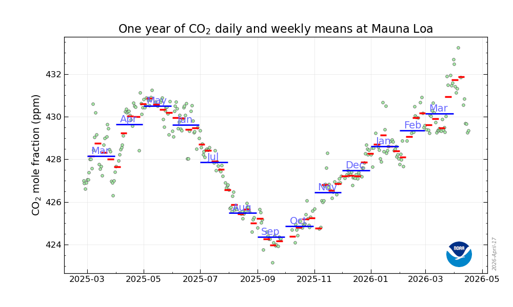 A taxa de CO2 na atmosfera durante 1 ano, com as habituais variações sazonais e pico no início de abril de 2026. © NOAA