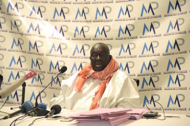 O senegalês Papa Massata Diack, filho de Lamine Diack, ex-chefe do atletismo mundial, falecido em 2021, durante conferência de imprensa em Dakar, 14 de setembro de 2020.