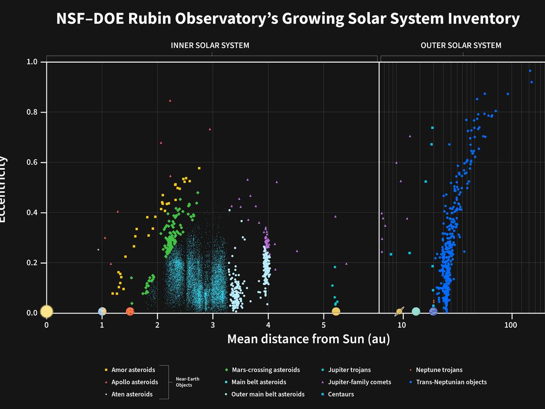 Distribuição orbital de 11.097 asteroides recentemente descobertos durante o Rubin Observatory Early Optimization Survey (NSF-DOE): cada ponto representa um objeto, classificado de acordo com sua distância média do Sol (em unidades astronômicas, 1 UA correspondente à distância Terra-Sol) e sua excentricidade orbital, ou seja, o alongamento de sua órbita. O lado esquerdo do gráfico mostra objetos do Sistema Solar interno em escala linear; o lado direito se estende até o Sistema Solar externo em uma escala logarítmica. A maioria das descobertas são asteroides do cinturão principal (10.279), com uma população significativa de objetos externos do cinturão principal (234) e objetos que cruzam a órbita de Marte (103). Além de Netuno, 380 objetos transnetunianos recém-descobertos são visíveis à direita, incluindo dois com órbitas extremamente alongadas (excentricidade > 0,9) atingindo cerca de 1.000 vezes a distância Terra-Sol. Os asteróides próximos da Terra – Amors (27), Apollos (5) e Atens (1) – aparecem a uma curta distância média do Sol. Cometas acoplados a Júpiter (57), Centauros (7), asteroides troianos de Júpiter (1) e asteroides troianos de Netuno (3) completam a lista de descobertas. A distribuição dos asteróides do cinturão principal é explicada por regiões subpovoadas onde repetidas perturbações gravitacionais de Júpiter eliminaram gradualmente os asteróides. Essas lacunas, chamadas “lacunas de Kirkwood”, são devidas a ressonâncias orbitais com Júpiter. Esses objetos foram identificados através de aproximadamente 1,6 mês de observações preliminares, antes do início da pesquisa LSST (Pesquisa Legada de Espaço e Tempo). © NSF – DOE Observatório Vera C.-Rubin, NOIRLab, SLAC, AURA