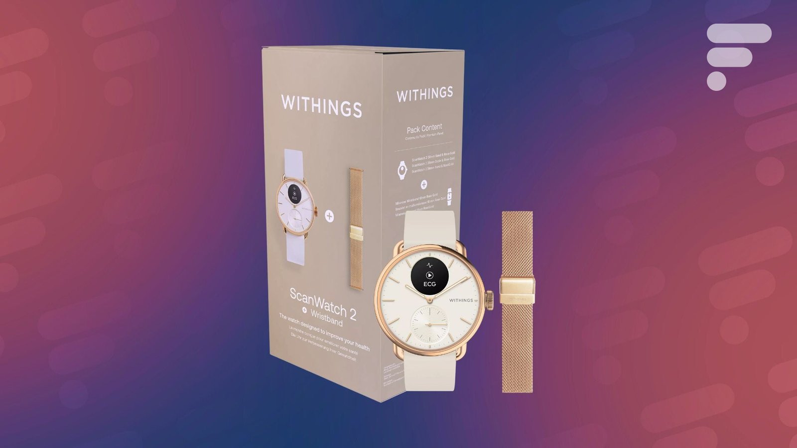 Oferecido inicialmente por 349,95 euros, o pack contendo um Withings ScanWatch 2 (Rose Gold) e uma pulseira milanesa grátis custa atualmente 299,95 euros na Boulanger.
