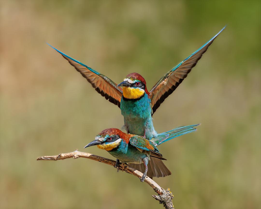 Acasalamento dos abelharucos europeus: uma fase fundamental do seu ciclo reprodutivo, muitas vezes precedida por ofertas de alimentos. © Andy Morffew, todos os direitos reservados