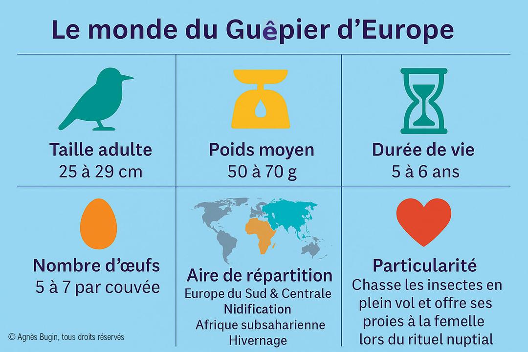 Ficha de identidade do abelharuco europeu: uma ave migratória colorida, que nidifica na Europa e inverna na África Subsaariana. © Criação Agnès Bugin – todos os direitos reservados