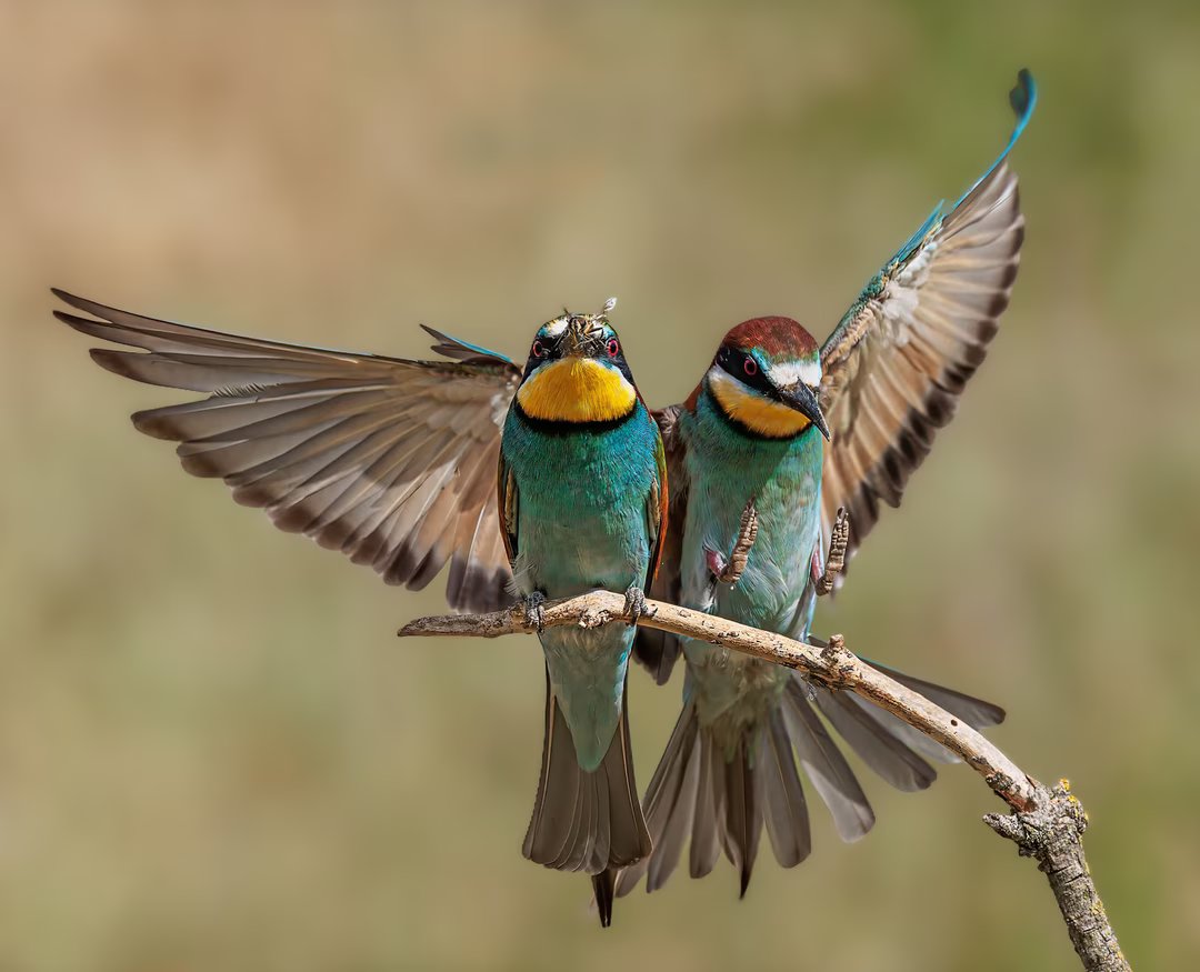 Um abelharuco europeu oferece presas ao seu parceiro, um gesto de sedução típico desta espécie colorida. © Andy Morffew, todos os direitos reservados