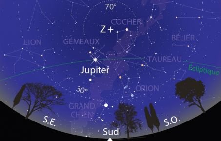 Aparecimento do céu por volta da meia-noite do meio do mês. Júpiter está perto do seu pico no coração das constelações de inverno. O brilho do planeta atinge o seu máximo anual por ocasião da sua transição para a oposição. Créditos: Johan Kieken/Sciences et Avenir