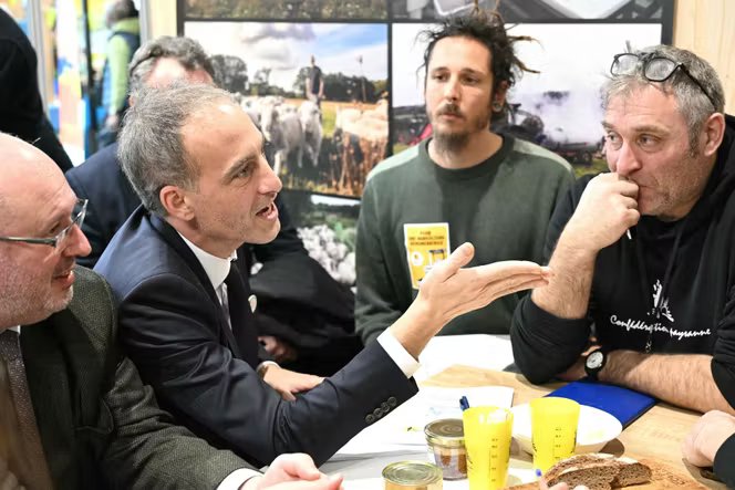 Raphaël Glucksmann, copresidente da Place publique, com membros da Confédération paysanne, durante a Feira Agrícola, em Paris, 23 de fevereiro de 2026.