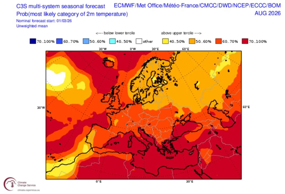 Relativamente ao Verão, as previsões actuais são unânimes… e bastante espectaculares! O Copernicus (que utiliza resultados de oito modelos de previsão diferentes) afirma que é quase certo que Julho e Agosto serão significativamente mais quentes do que a média.